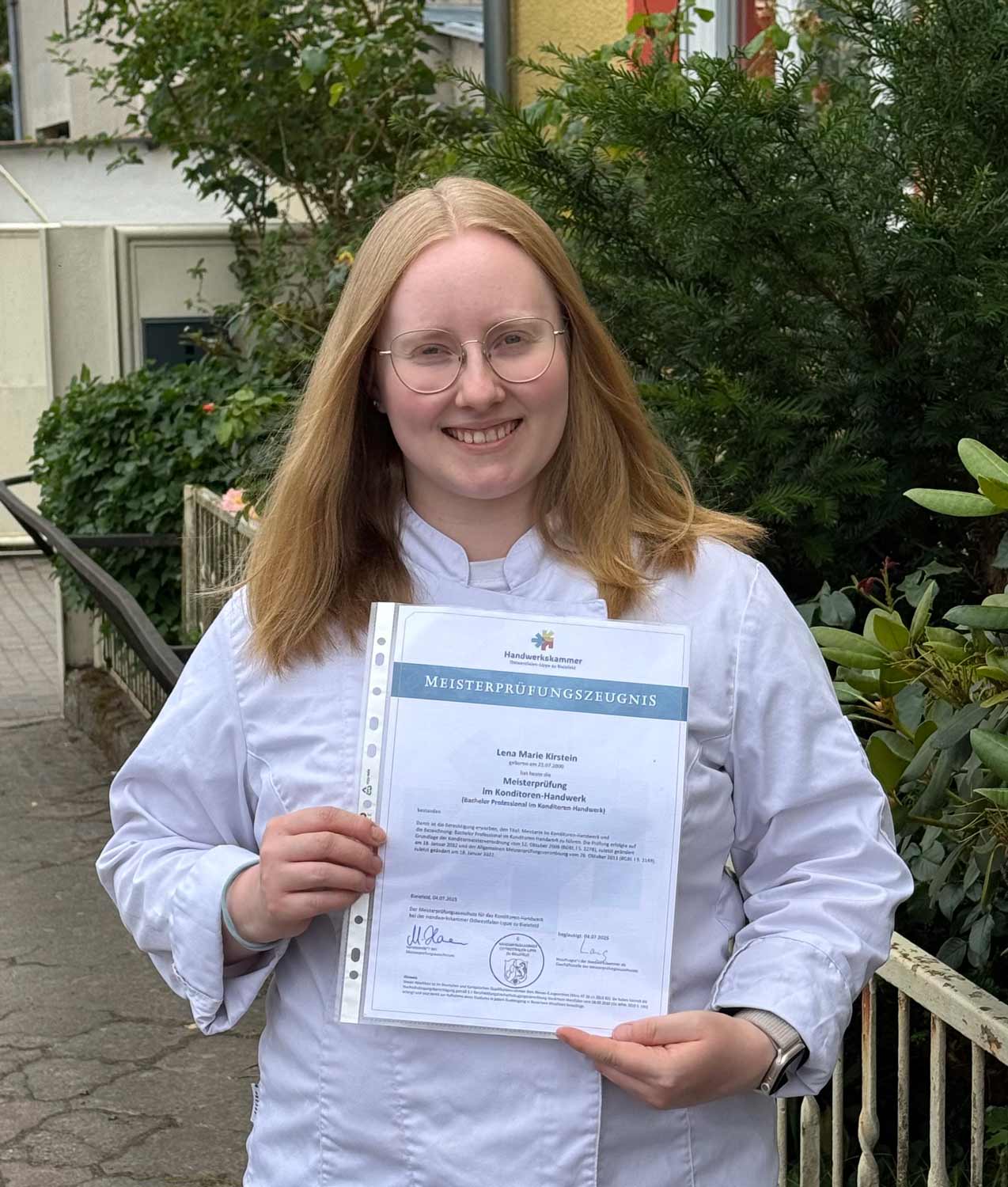 Den ersten Teil der Meisterschule absolvierte sie 2023 in Götz, wo betriebswirtschaftliches Handeln und das Ausbilden gelehrt werden. Im Februar 2025 begann sie dann den zweiten Teil, für den sie sich an der renommierten Handwerkskammer Ostwestfalen-Lippe in Bielefeld eingeschrieben hatte. Am Ende des 3,5-monatigen Kurses in Bielefeld, in dem sie ihr Wissen über das Konditorenhandwerk vertiefen und erweitern konnte, stand dann am 04. Juli 2025 die finale Prüfung an, welche Lena Kirstein auf Anhieb meisterte.