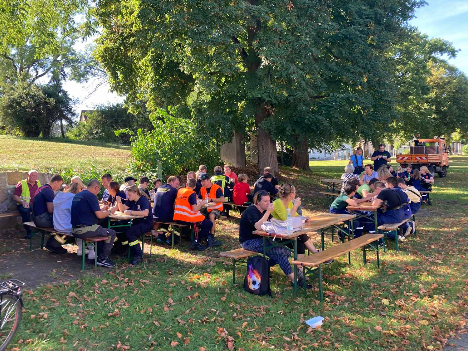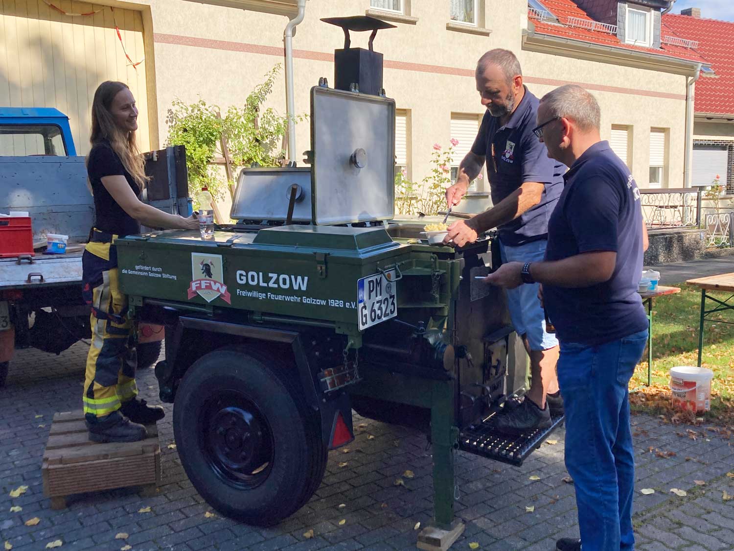 „Es ist ein gutes Gefühl, gemeinsam etwas Gutes zu tun“, sagte eine Teilnehmerin. Nach getaner Arbeit schmeckten die Nudeln mit Tomatensoße aus der Gulaschkanone der Freiwilligen Feuerwehr Golzow umso besser.