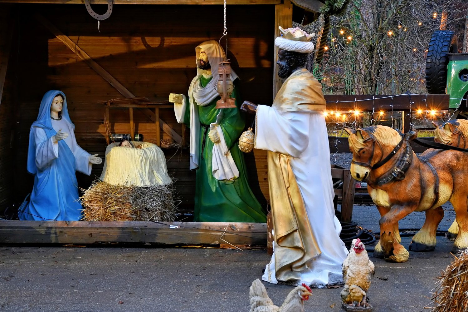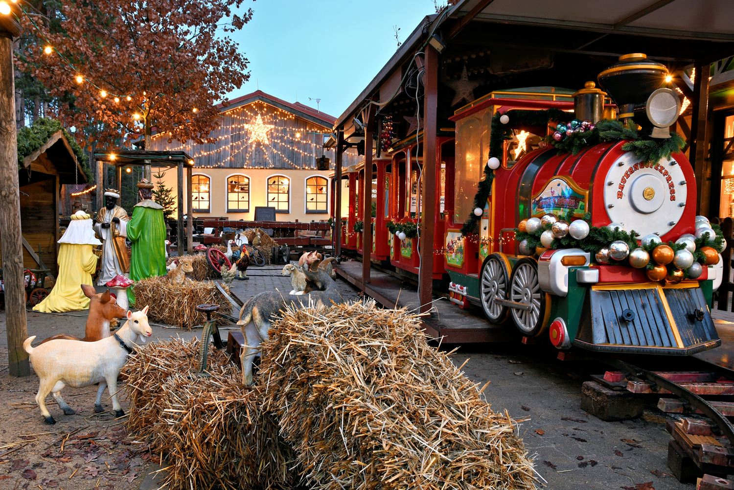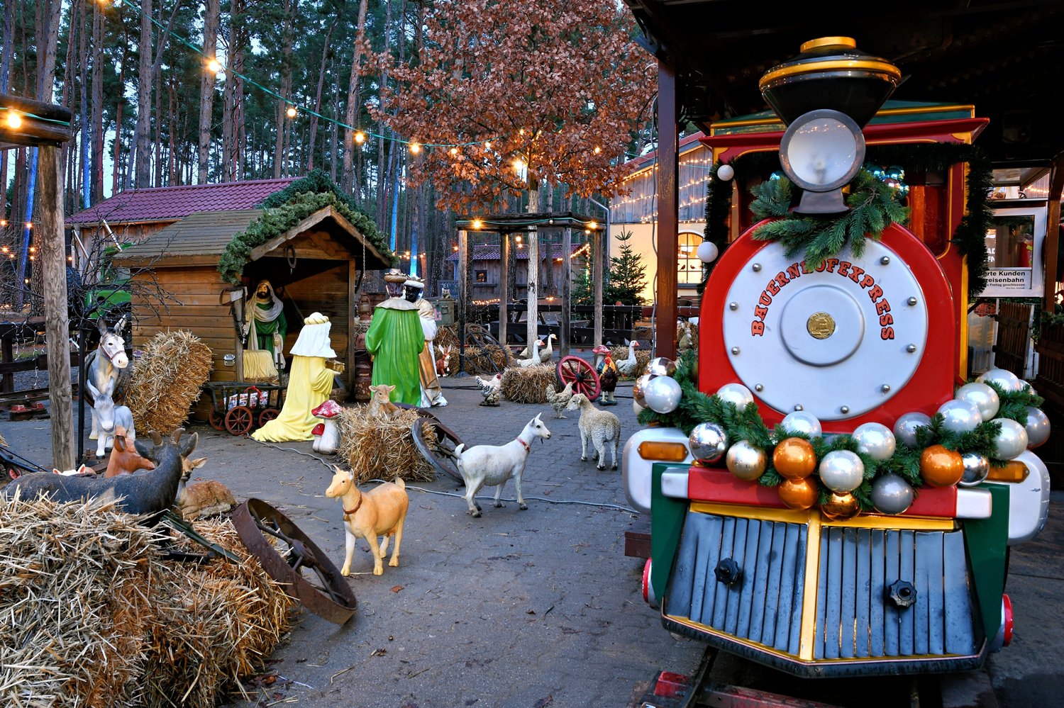 Tannenbäume, Weihnachtskrippe mit einem Bauernhof und Eisenbahnkarussell, bunt geschmückte
