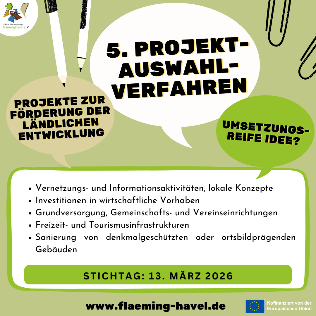 Potsdam-Mittelmark. Zur Umsetzung unserer Regionalen Entwicklungsstrategie (RES) 2023 – 2027 in der LEADER-Region Fläming-Havel rufen wir zur Teilnahme am fünften Projektauswahlverfahren auf.