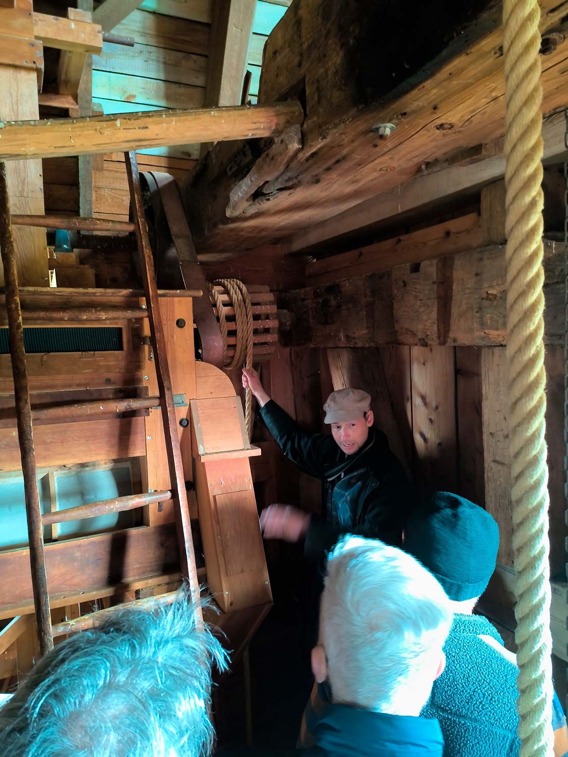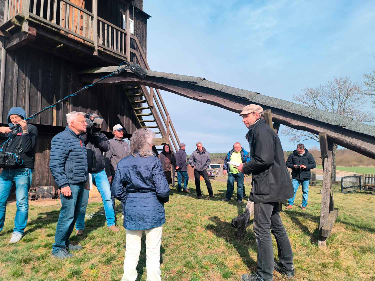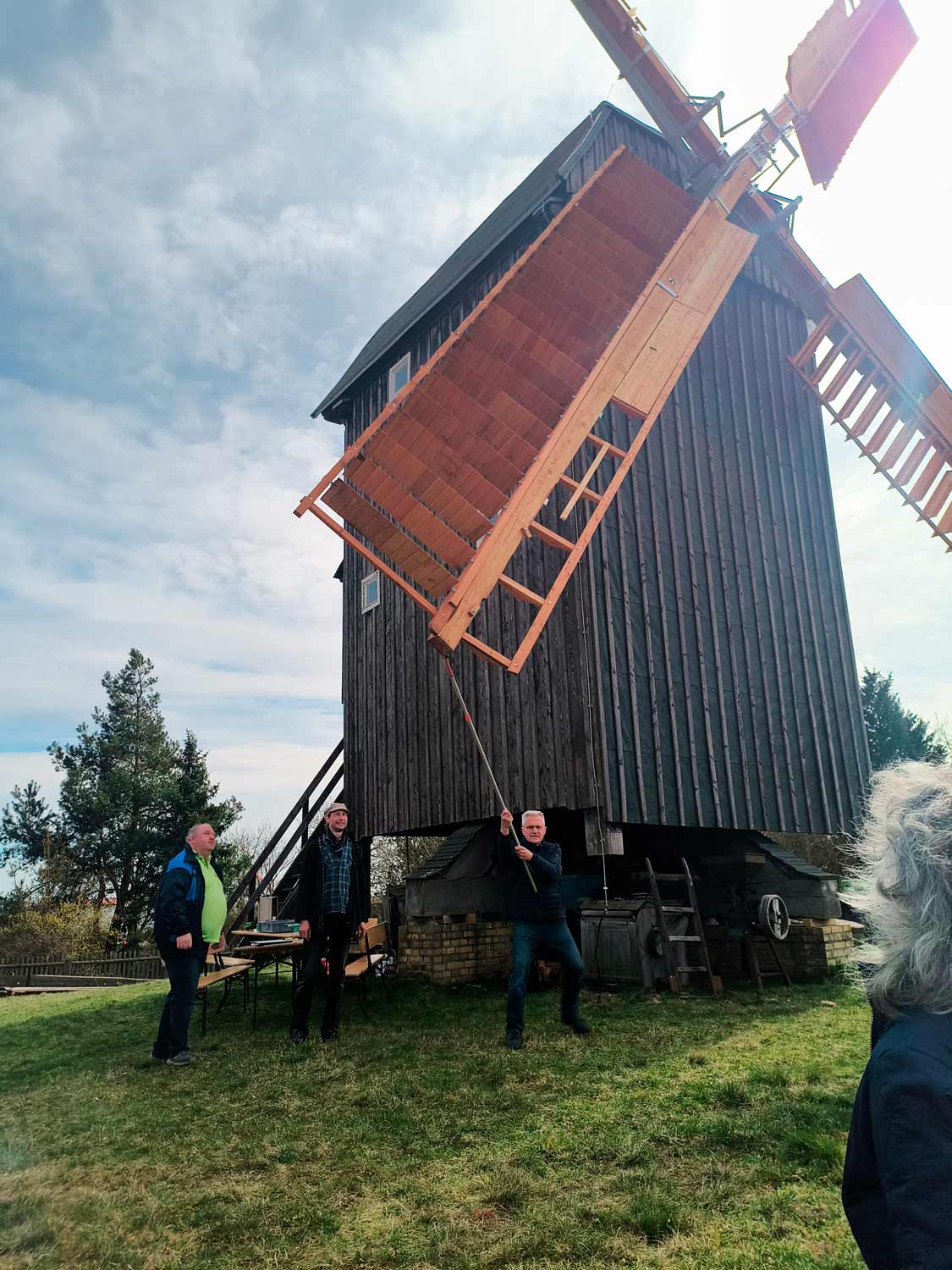 Der erfahrene Windmüller Fredrik Schüler, der sonst an der Sanssouci-Mühle tätig ist und sich in der Mühlenvereinigung Berlin-Brandenburg engagiert war, am 28. März 2026 der Kursleiter. Im Vordergrund stand in den ersten vier Stunden die Betriebssicherheit mit Fragen rund um das Lösen der Bremse und „was muss ich tun, damit die Mühle sich dreht“.