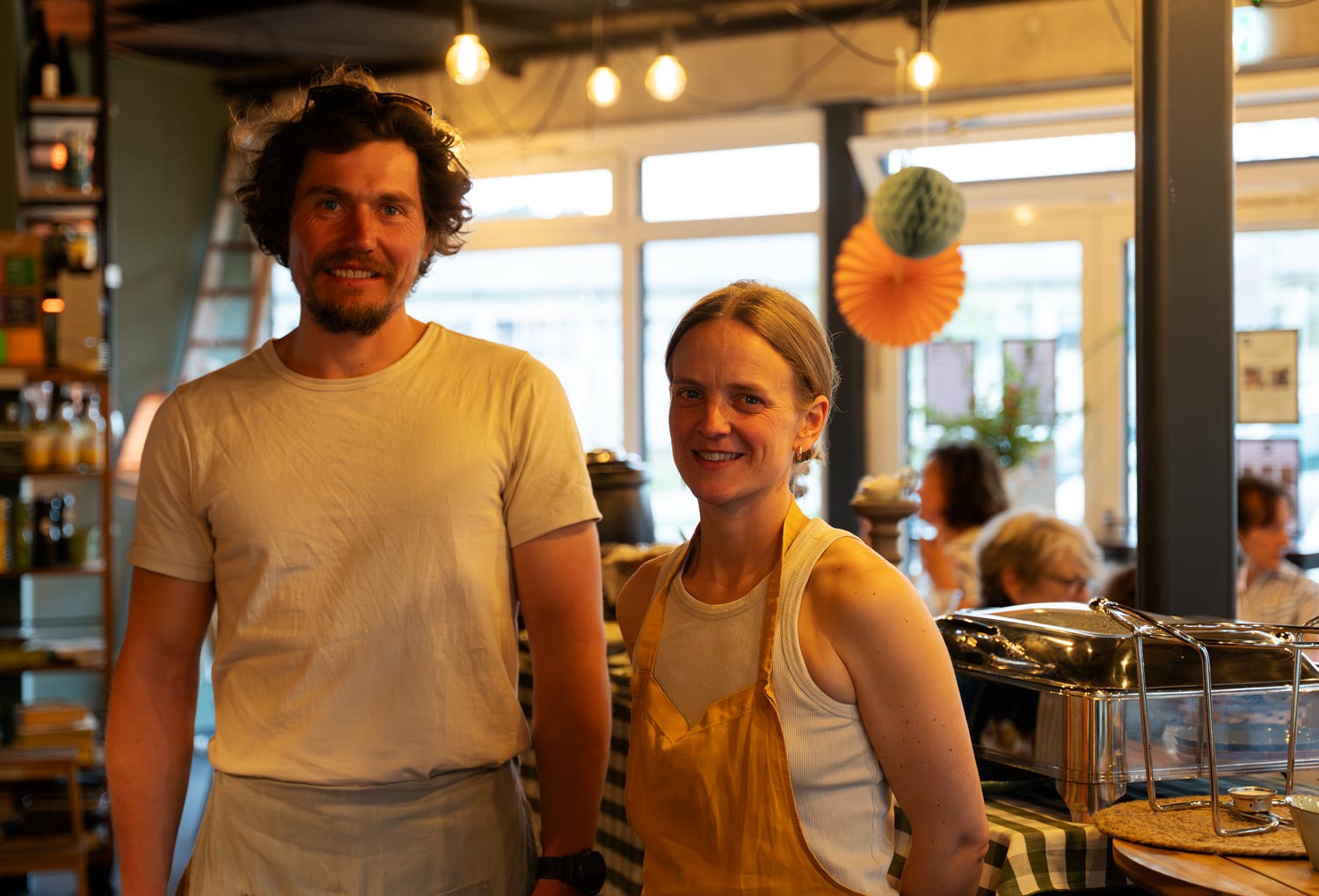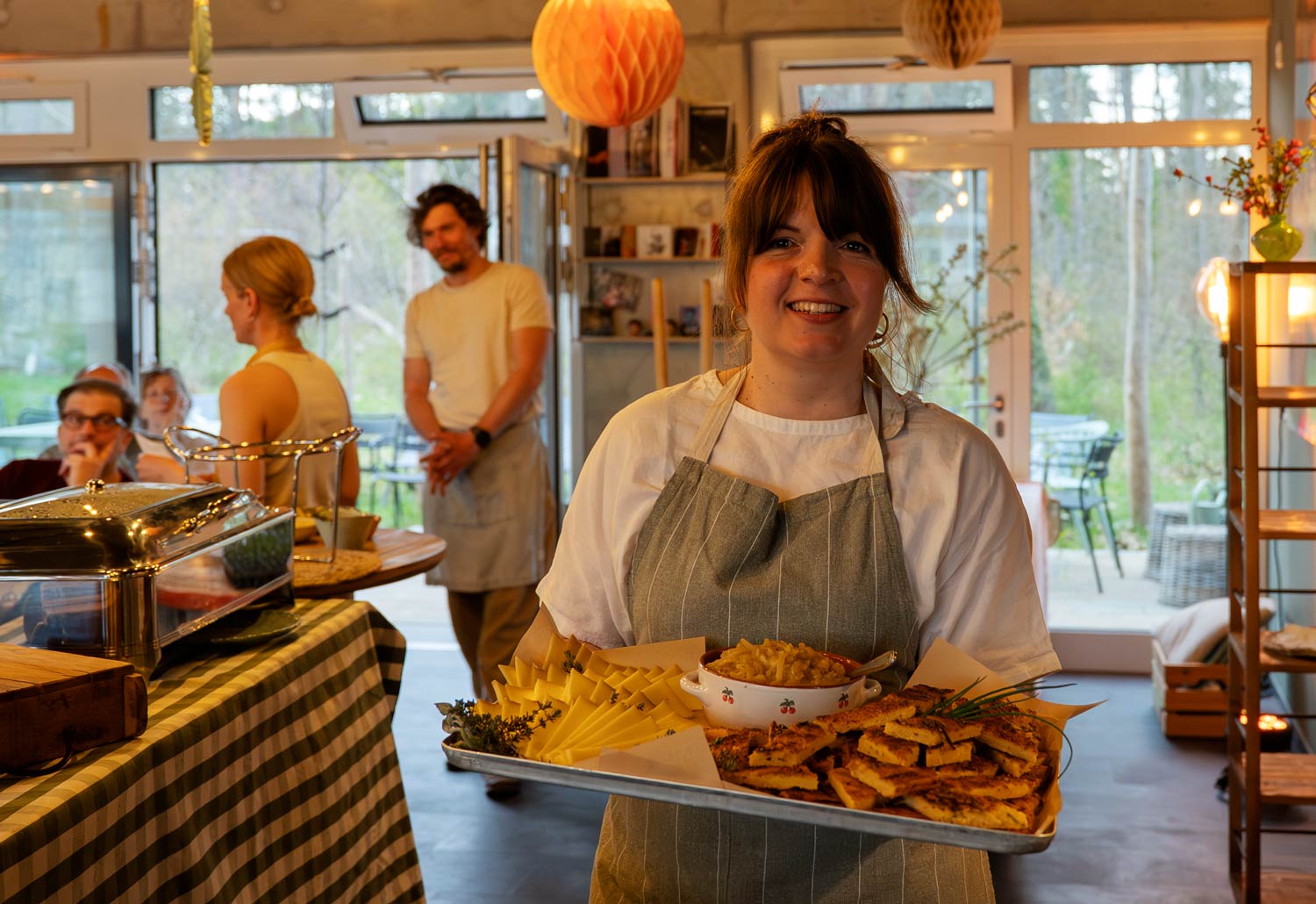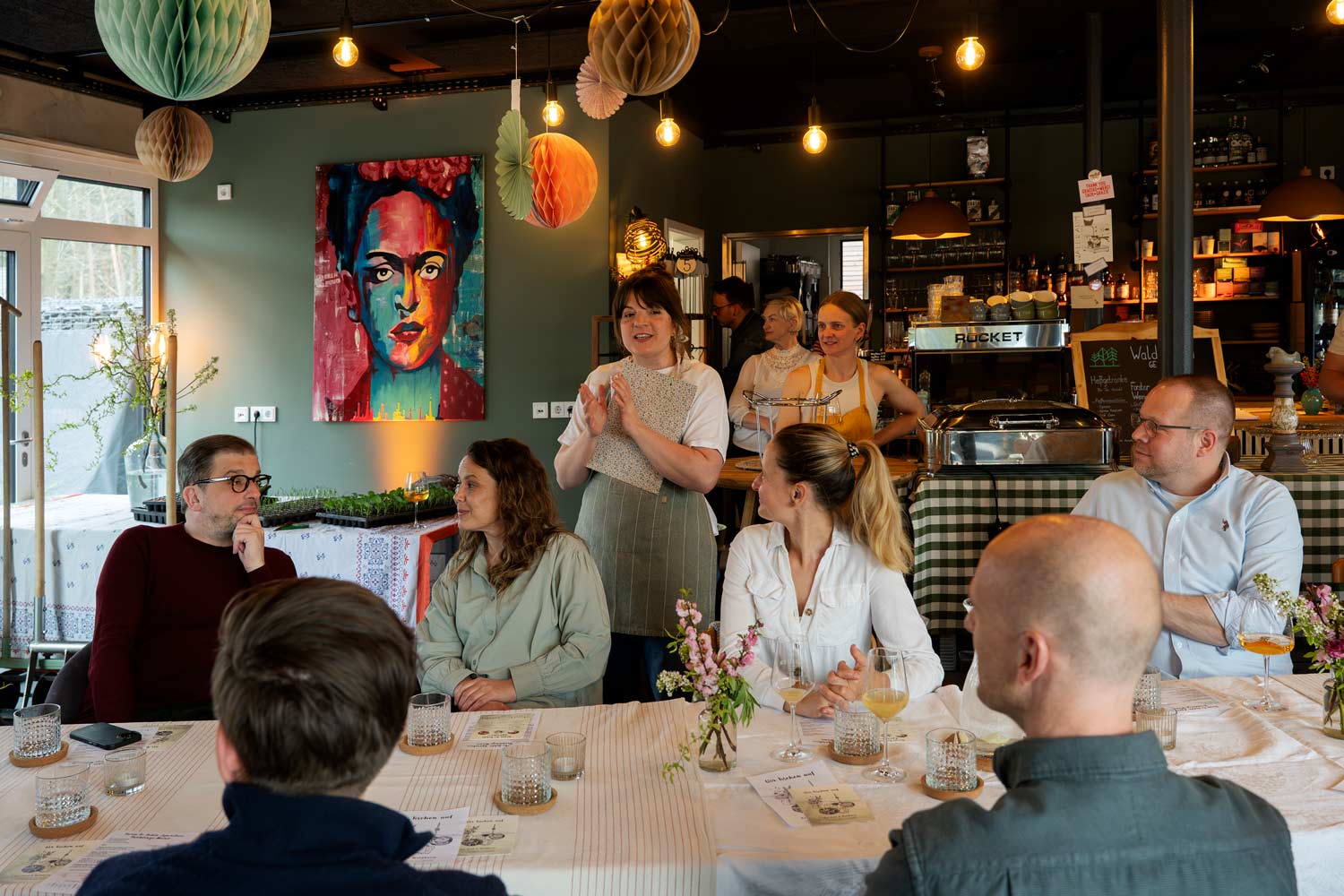 Die erste von insgesamt vier Veranstaltungen fand im beliebten Borkheider Café Waldraum statt. Selbst Stammgäste waren überrascht, was Franzi, wie sie auch Gäste nennen dürfen, aus den erst 2026 ausgesäten oder über den Winter eingelagerten Produkten von Sonja und Jim zauberte: Hausgebackenes Sauerteigbrot und Focaccia mit Humus, Kräuterbutter und eigelegten Gurken, toskanischer Kichererbsen-Kuchen, Pizza Bianca mit Rote Beete Carpaccio, Pastinaken-Sellerie-Birnen-Creme-Süppchen, Ofengemüse, Crespelle mit Schwarzwurzel-Ricotta-Füllung, Kichererbsen-Salat, … – Es hörte sich nicht nur klangvoll an, sondern schmeckte auch hervorragend, wie die Gäste einstimmig bekundeten.