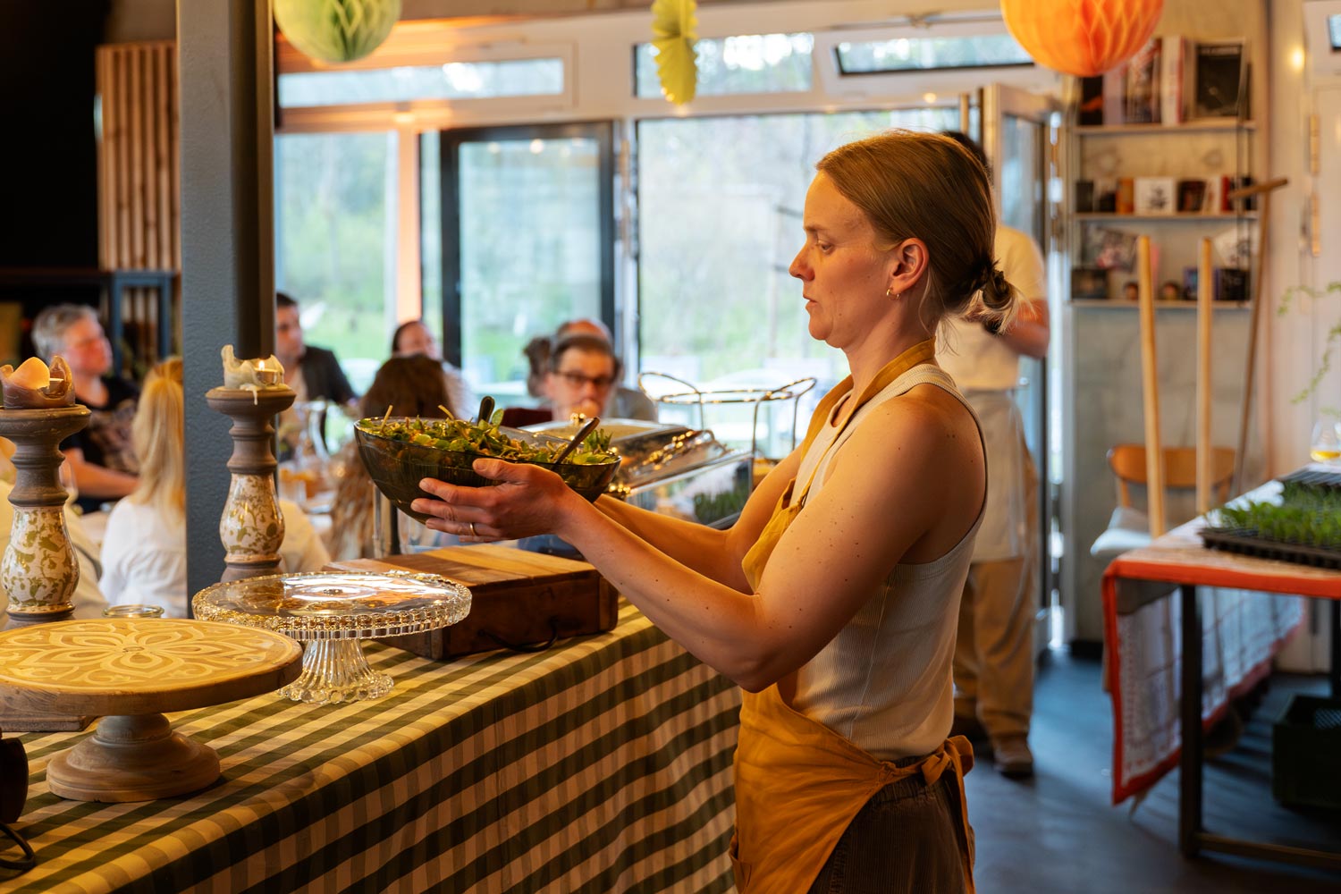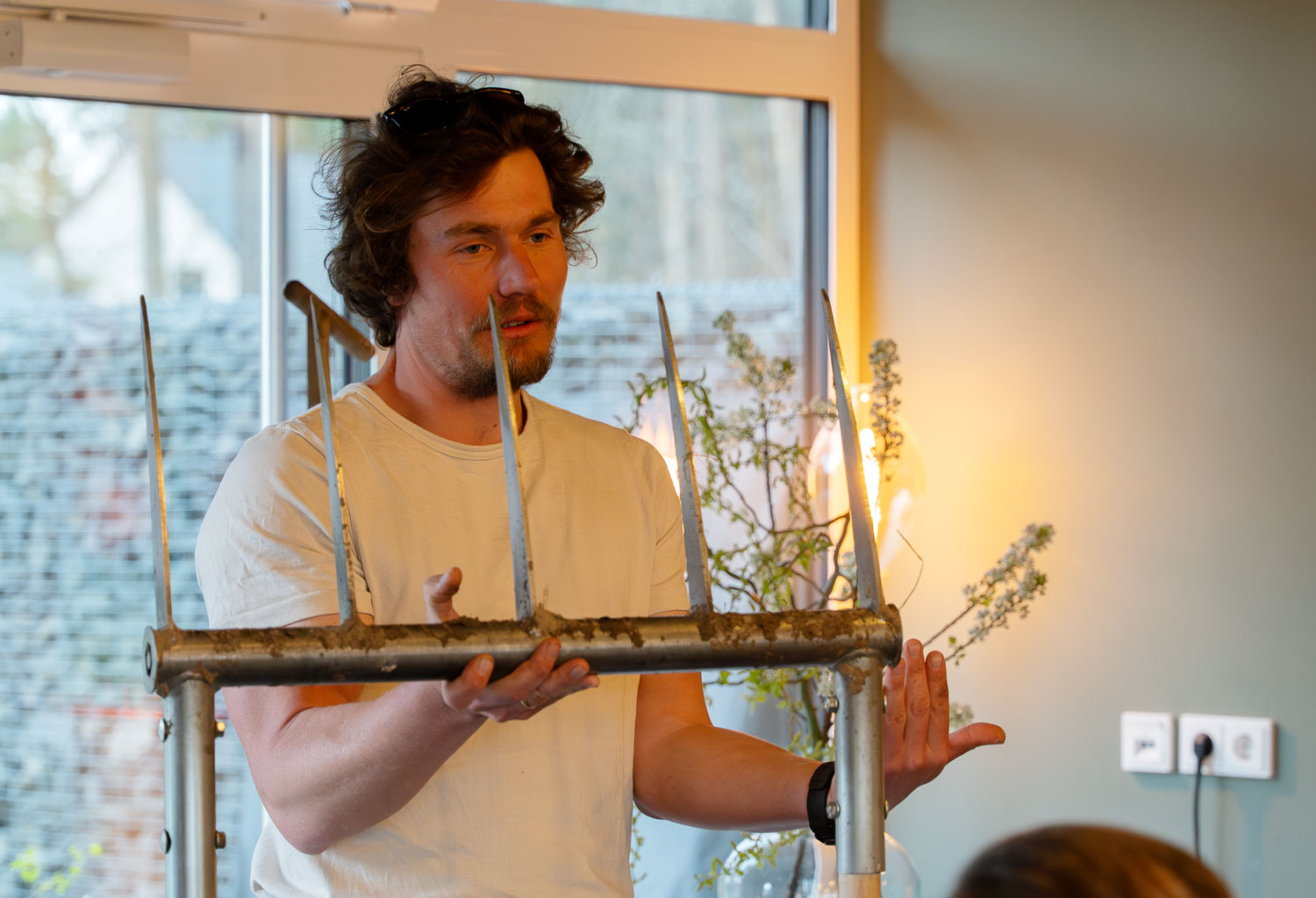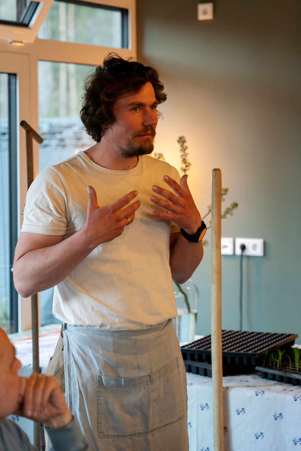 Und tatsächlich haben sowohl Franzi aus der Küche als auch Sonja und Jim vom Acker viel zu erzählen. Vor fünf Jahren haben letztere den Hof von ihrem Vorgänger übernommen. Hauptsächlich bauen sie Schnittblumen und Obst an. Beim Gemüseanbau setzen sie auf kleinere, intensiv genutzte Flächen mit dem Fokus auf Handarbeit, Artenvielfalt und schonendem Umgang mit dem Boden (Market Garden). Sie säen, ernten und verarbeiten ihre Produkte überwiegend von Hand. Der Name ihres Unternehmens ist Programm. Dazu braucht es besondere Geräte, die Jim den Gästen zwischen den einzelnen Gängen erklärt.
