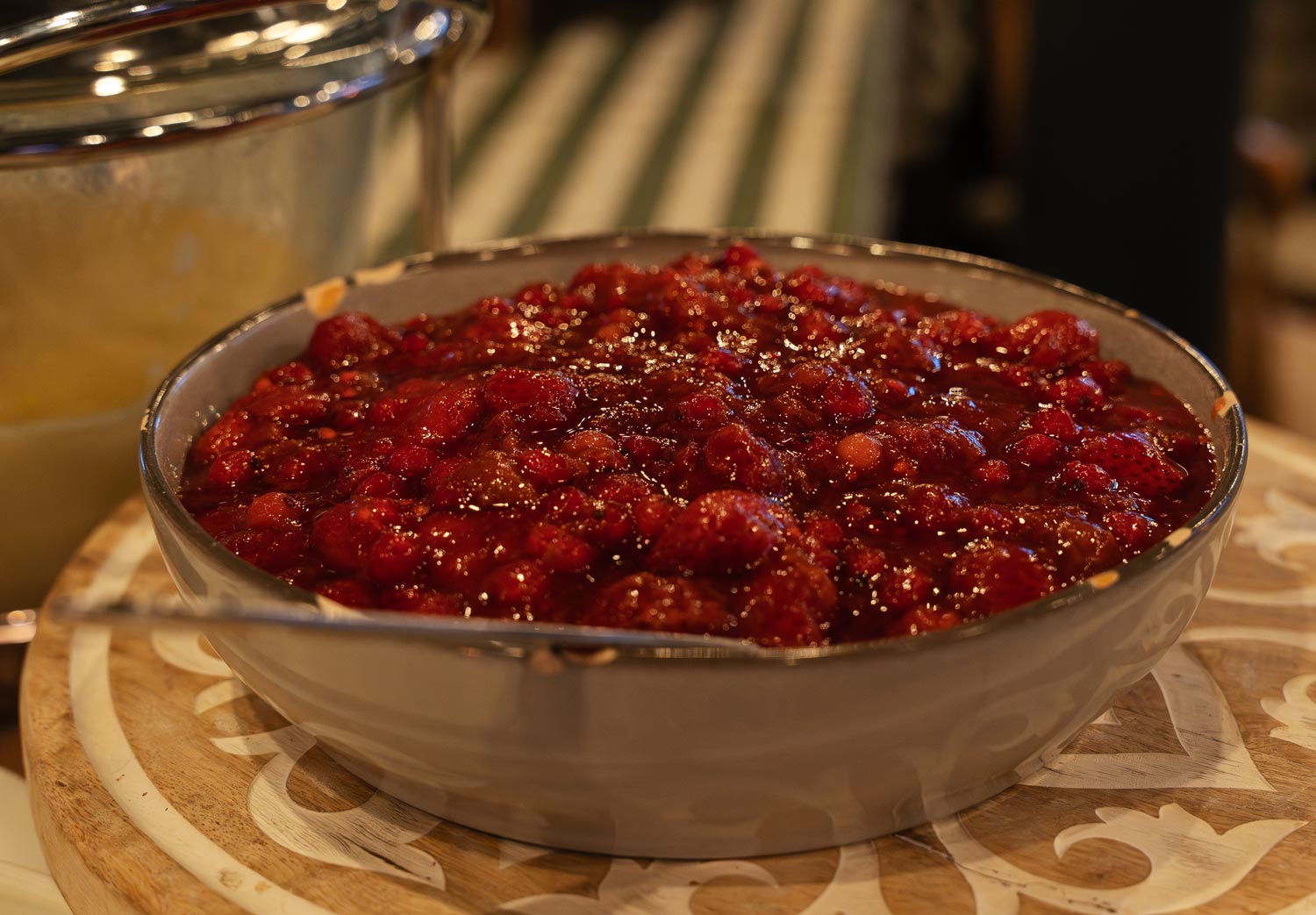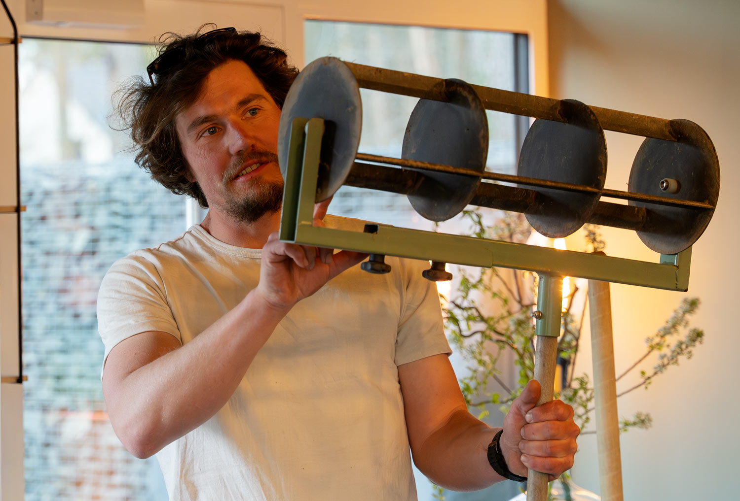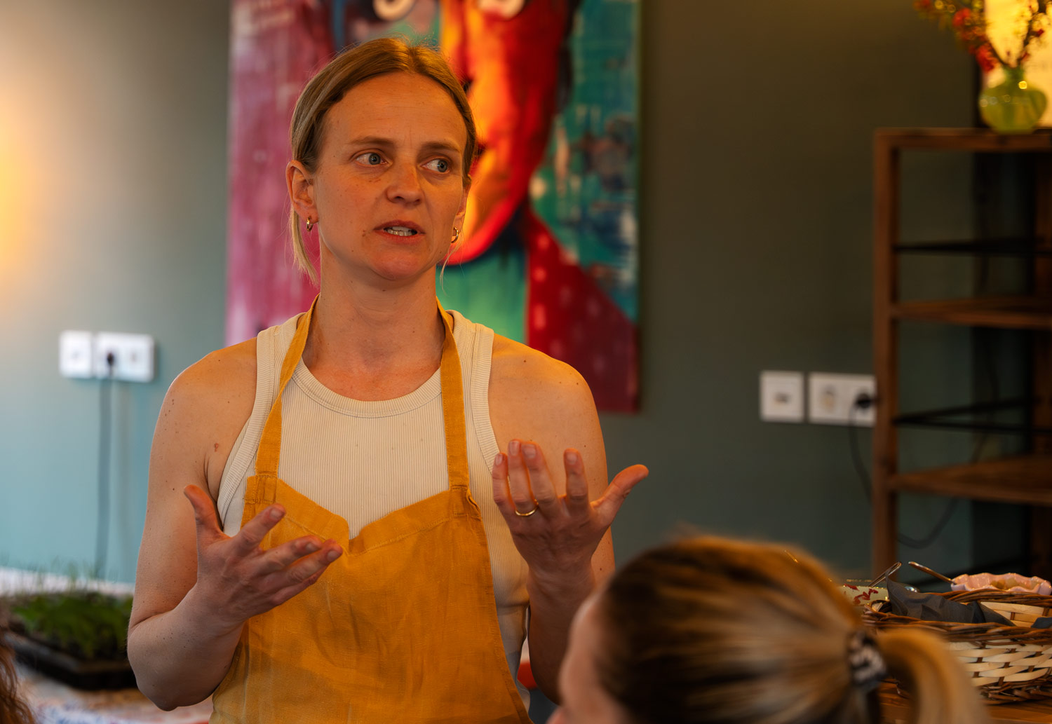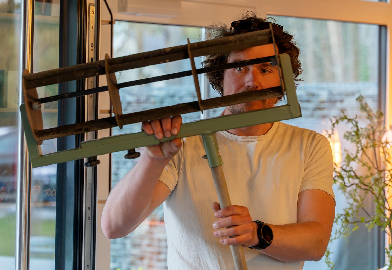 Und tatsächlich haben sowohl Franzi aus der Küche als auch Sonja und Jim vom Acker viel zu erzählen. Vor fünf Jahren haben letztere den Hof von ihrem Vorgänger übernommen. Hauptsächlich bauen sie Schnittblumen und Obst an. Beim Gemüseanbau setzen sie auf kleinere, intensiv genutzte Flächen mit dem Fokus auf Handarbeit, Artenvielfalt und schonendem Umgang mit dem Boden (Market Garden). Sie säen, ernten und verarbeiten ihre Produkte überwiegend von Hand. Der Name ihres Unternehmens ist Programm. Dazu braucht es besondere Geräte, die Jim den Gästen zwischen den einzelnen Gängen erklärt.